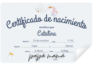 Un hermoso certificado personalizable que conmemora el nacimiento de tu bebé. Este documento imprimible, diseñado con delicadeza y atención al detalle, incluye el nombre del bebé, la fecha y hora de nacimiento, y otros datos especiales que hacen de este un recuerdo único e invaluable.